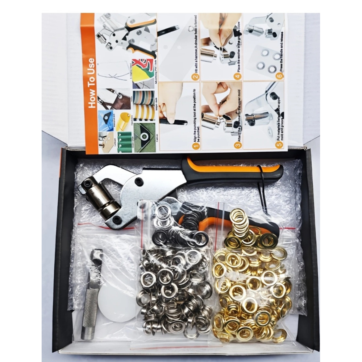 Пристрій для встановлення люверсів 10-15 мм із люверсами срібного кольору
