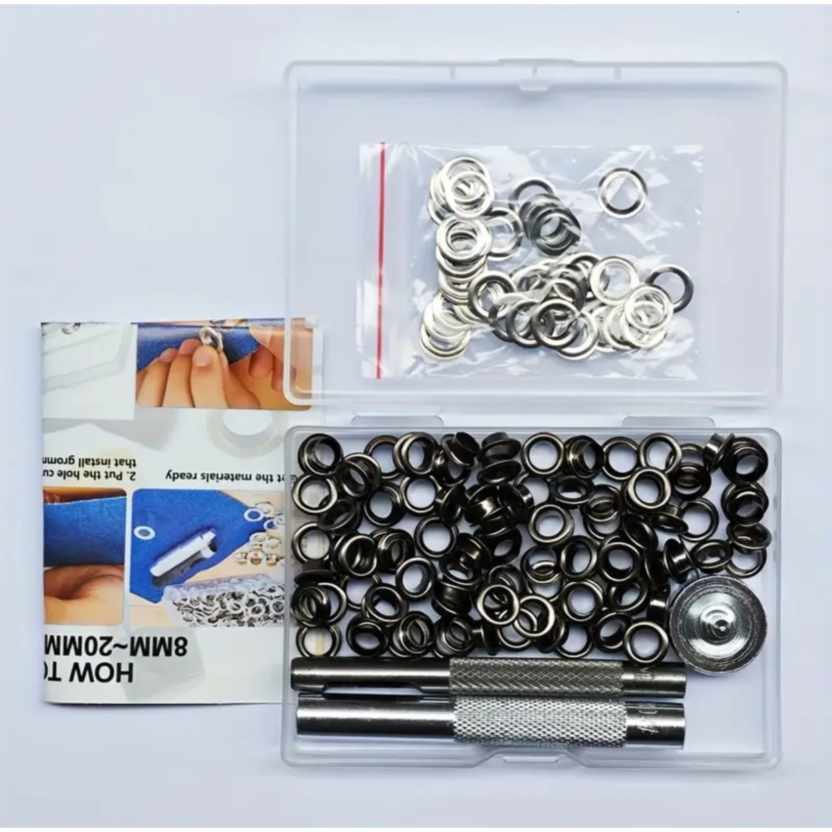 До набору входить пристрій для встановлення Люверсів  до 6-10 мм, 100  люверсів нікневого кольору  10 мм (зовнішній діаметр)