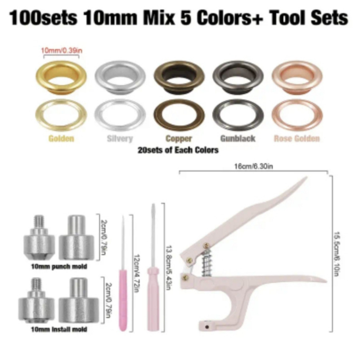 Пристрій для встановлення люверсів  до 10-15 мм із матрицею. У наборі: 100 люверсів різних кольорів  15 мм (зовнішній діаметр)